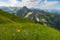 Bergpanorama met alpenbloemen van Laufbacher-Eckweg tot Höfats, 2259m, Allgäuer Alpen, Allgäu, Beieren, Duitsland, Europa