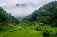 Bergdorp Pu Luong in Vietnam, Azië. Groene rijstvelden, bergen, bomen en witte wolken. Er stroomt een klein riviertje door het dorp heen. Riete huisje tussen het groen. Oosterse wanddecoratie.