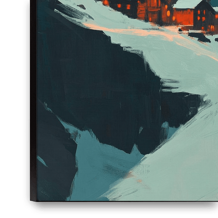 Een dromerig bergdorp, zachtjes omhuld door glinsterende sneeuw en majestueuze bergtoppen, nodigt je uit om te blijven hangen. De warm gloeiende hutten stralen gezelligheid uit, terwijl het gouden licht van de middagzon het landschap zachtjes omarmt. Dit kunstwerk is ideaal voor de woonkamer, creëert een uitnodigende sfeer en roept…