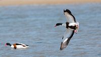 Bergeend in de vlucht bij het strand van Ballum, Ameland, Holland.