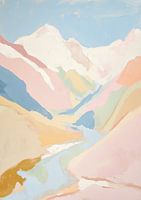 Dit kunstwerk toont een sereen berglandschap in een zacht pastelkleurenpalet. De compositie benadrukt besneeuwde toppen en zacht glooiende heuvels en maakt gebruik van vereenvoudigde vormen en brede, zachte penseelstreken. Een kronkelende rivier stroomt door het midden en trekt het oog naar de verre horizon. De kleuren - lichtblauw,…