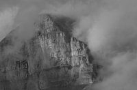 Steilen bergwand in de mist in grijstonen.