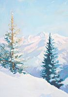 Een impressionistisch schilderij van een besneeuwd alpenlandschap met altijd groene bomen, gedempte kleuren, een blauwe lucht, witte sneeuw en roze bergen op de achtergrond. Het schilderij is in een vintage olieverfstijl met een minimalistische esthetiek, wat resulteert in een prachtig tafereel.