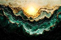 Dit indrukwekkende ontwerp toont een dynamisch samenspel van groene bergen, omrand door goudtinten, en een stralende gouden zon aan de horizon. De lagen en texturen zorgen voor een betoverend effect dat beweging en diepte creëert. Perfect voor wie een opvallend en luxe kunstwerk zoekt dat een natuurlijke en rustgevende sfeer uitstraalt. Ideaal voor een moderne woonkamer of kantoorruimte.