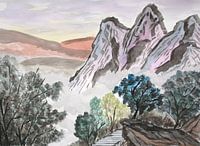 traditioneel aquarelschilderij van bergen met bos op de voorgrond en heuvels in de verte.