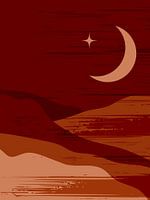 Dit kunstwerk toont een rustgevend retro-landschap met een opkomende volle maan boven zachte, glooiende heuvels. De minimalistische vectorstijl, versterkt met subtiele textuur, maakt gebruik van warme terracotta- en sepiatinten om een serene sfeer te creëren. Dit ontwerp is geïnspireerd op boho-interieurs en vintage poster-esthetiek en werkt prachtig in Scandinavische, Japanse of moderne rustieke ruimtes. De eenvoud en symmetrie bieden een gevoel van rust, waardoor het ideaal is voor slaapkamers, meditatiehoeken of gezellige woonkamers. Als onderdeel van een samenhangende serie met vergelijkbare thema's en paletten, geeft dit stuk een harmonieuze touch aan galerie muren of op zichzelf staande displays. De natuurlijke vormen en warme kleuren passen perfect in een seizoensstijl en roepen rustige herfstavonden en stille woestijnlandschappen op. Een must-have voor liefhebbers van retro design, warme kleuren en moderne bohemien interieurs.