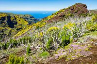 In bloemen gehulde bergen met uitzicht op de Atlantische Oceaan vormen een prachtig landschap op het Portugese eiland Madeira.