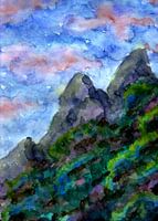 traditioneel aquarelschilderij van hoge bergen verlicht door een zonsondergang in surrealistische kleuren.