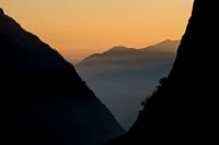Stijlen bergen in Nepal met een zonsondergang of zonsopkomst. Intense kleuren en contrast. Diepe gele kleur. Donkere framing van foto.