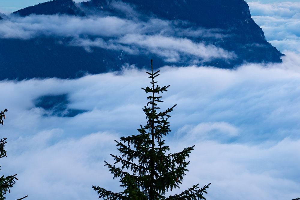 De foto toont de Mittagskopf en de Pendling in de Tiroler Alpen boven een zee van mist. De opkomende zon geeft de lucht zijn dromerige pastelkleuren. De naaldbomen op de voorgrond geven de foto, die is genomen vanaf de top van de Kragenjoch, een prachtig diepte-effect.
