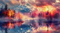 De ochtend ontwaakt boven het meer dat diep in de vallei van de ongerepte wildernis ligt. De eerste zonnestralen breken door de wolken en baden het landschap in een zacht licht, terwijl de mist zich ophoopt boven het stille water. De herfstkleuren van de bomen gloeien in warme tinten rood, oranje en geel, als een geschilderde droom, omlijst door majestueuze, besneeuwde bergtoppen. In de perfecte stilte van de ochtend lijkt de wereld in rust te zijn, met alleen het zachte kabbelen van het water en het ruisen van het bos in de verte te horen. Het moment is vluchtig, een magische betovering van de natuur die snel zal vervagen, maar voor altijd is vastgelegd op deze foto.