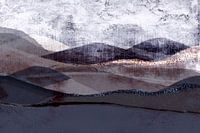 Een abstract berglandschap schilderij van organische geometrische bergvormen met een lichte expressionistische textuur in wit, ivoor, grijs, warm grijs, blauwgrijs, koper, goud en beige kleuren met een impressie van Scandinavische kunst uit Noord-Europa.