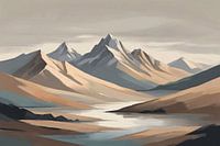 Ontdek de rustgevende schoonheid van dit minimalistische berglandschap, waar eenvoud de essentie van elegantie vangt. De gedempte kleurtonen van beige, bruin en grijs vermengen zich in harmonieuze overgangen, waarbij de zachte blauwe tinten van het water rust en vrede uitstralen. Elke penseelstreek draagt bij aan het gevoel van sereniteit, waardoor dit kunstwerk een oase van rust biedt in de hectiek van het dagelijks leven. Perfect voor het verfraaien van een moderne woonkamer of een rustig kantoor, dit schilderij nodigt de kijker uit om stil te staan bij de majesteit van de natuur en de stilte die het met zich meebrengt.
