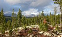 Dennenbomen op een aars witte mosbodem voor het bergmassief met de toppen Hogronden, Midtronden en Digerronden en Storronden in Rondane Nationaal Park in Noorwegen