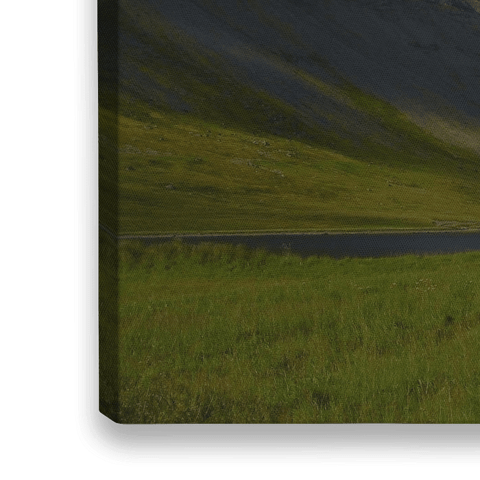 Zacht groen en bruin afgewisseld met witte wolken in een felblauwe Ijslandse lucht.