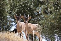 Twee berggeiten kijken nieuwsgierig vanaf een afgelegen bergweitje in de provincie Granada Spanje de fotograaf.