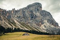Een eenzame berghut in een alpenweide in de Dolomieten, tegen de achtergrond van de indrukwekkende Peitlerkofel in Italië.