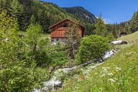 Berghut en bergbeek op de Ahrntal Zonnepad bij St. Jakob im Ahrntal, Zuid-Tirol, Italië