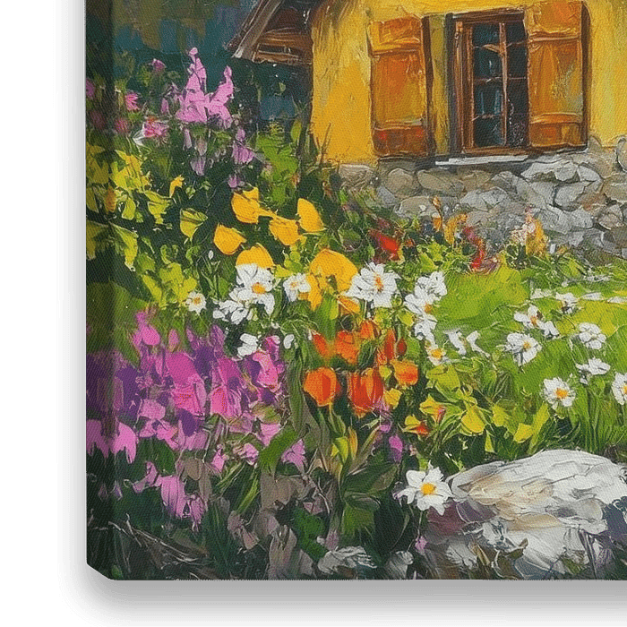 Een pittoresk toevluchtsoord straalt een gevoel van geborgenheid uit, omringd door fleurige bloemen en het majestueuze panorama van besneeuwde bergen. De warme gele kleur van de hut contrasteert perfect met het diepe blauw van de lucht, terwijl zachte grassen dansen in de wind. De idyllische omgeving nodigt uit om te vertoeven en te…