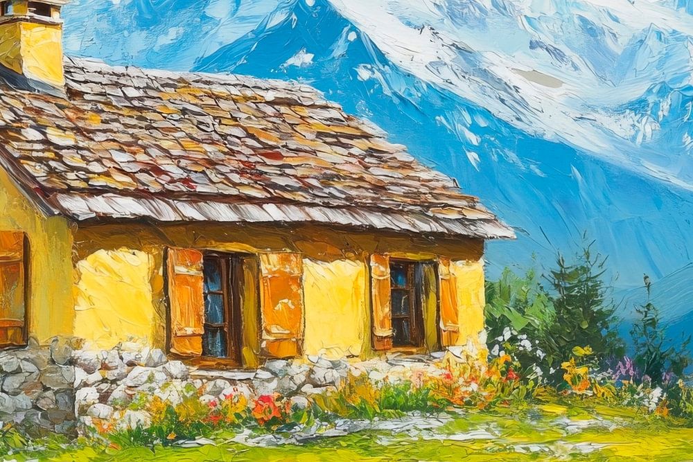 Een pittoresk toevluchtsoord straalt een gevoel van geborgenheid uit, omringd door fleurige bloemen en het majestueuze panorama van besneeuwde bergen. De warme gele kleur van de hut contrasteert perfect met het diepe blauw van de lucht, terwijl zachte grassen dansen in de wind. De idyllische omgeving nodigt uit om te vertoeven en te dromen, een echt toevluchtsoord in de natuur.