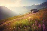 Hier wil iedere natuurliefhebber zijn. Met dit werk haal je de natuur in huis. Een berghut in een prachtig landschap met een fantastische lichtval. Bergweide met bloemen.