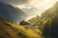 Hier wil iedere natuurliefhebber zijn. Met dit werk haal je de natuur in huis. Een berghut in een prachtig landschap met een fantastische lichtval.