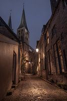 doorkijkje vanuit de kerksteeg op de st Nicolaas of ook wel Bergkerk in Deventer. Avondopname in het blauwe uurtje net na zonsondergang. lichtval langs de oude gevels