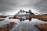 Met sneeuw bedekte bergvorming weerspiegeld in een vijver, graspluimen in en naast de vijver, grassprieten worden gedeeltelijk door de wind bewogen, wolkenbewegingen worden zichtbaar door langdurige blootstelling, groot diepte-effect - Locatie: IJsland, zuidkust