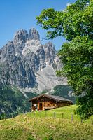Op een almweide staat een klein, authentiek houten almhut met een paar melkbussen aan de muur. Op de achtergrond staat de majestueuze berg Bischofsmütze. Deze naam is ontstaan door de vorm van deze berg: bisschopsmijter.