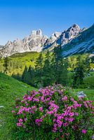 Een grote struik vol met bloeiende alpenroosjes staat op een almweide aan de voet van schroffe bergen. Op de achtergrond staat de hoogste bergtop van de Gosaukamm, de Bischofsmütze. Dit is een markante berg op de grens tussen Annaberg en Filzmoos in Salzburg.