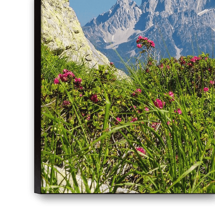 Op een almweide bloeien de alpenroosjes, in het Oostenrijks dialect ook wel "Almrausch" genoemd. Op de achtergrond staat het massief van de Dachstein met de drie bergtoppen Torstein, Mitterspitz en Hohe Dachstein. Samen vormen ze de Dachstein-Zuidwand die tot wel 1.000 meter hoog is en daarmee één van de hoogste steile wanden in de Oostalpen is.