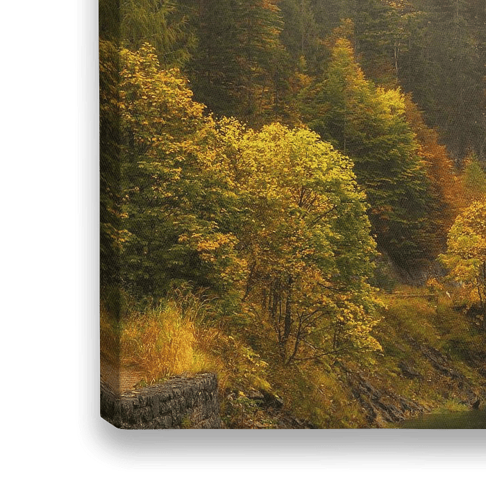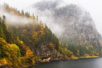 Mist hangt tussen de verkleurde bomen aan de oever van een bergmeer. Desondanks is het motief kleurrijk en mysterieus.
