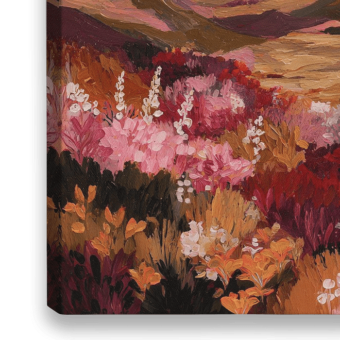 Een levendig berglandschap in roze en paarse tinten. Ideaal voor een dromerige en artistieke uitstraling in huis.