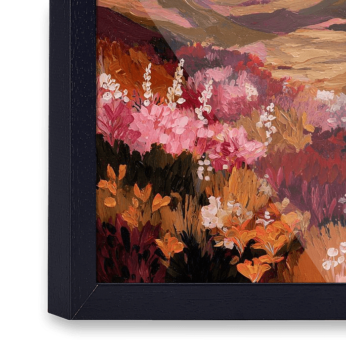 Een levendig berglandschap in roze en paarse tinten. Ideaal voor een dromerige en artistieke uitstraling in huis.
