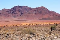 Kleurrijk en desolaat woestijnlandschap, Namibië, Afrika. Paarse bergen en oranje woestijn onder een blauwe lucht. Op de voorgrond een verlaten vlakte met keien en stenen.