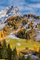In het gebied van de Hofalmen in het Oostenrijkse Filzmoos smelt de eerste sneeuw van het jaar weg. De goudgeel gekleurde lariksen staan als kaarsvlammetjes in het landschap. Een klein houten hutje geeft de foto extra diepte. Op de achtergrond staat de indrukwekkende Torstein, één van de hoogste toppen van het Dachsteinmassief en de…