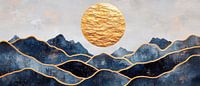 Een gouden zonlicht breekt door het zachte blauw van de bergen en geeft de kamer een harmonieuze warmte. De elegante lijnen die het landschap vormen creëren een rustgevende dynamiek. Dit kunstwerk past perfect in de woonkamer en creëert een uitnodigende, ontspannen sfeer die uitnodigt om te dromen.