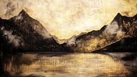 Deze artistieke afbeelding toont een vredig berglandschap bij zonsondergang, gekenmerkt door warme gouden tinten en kalme reflecties op stilstaand water. De majestueuze bergtoppen, badend in zacht goud, torenen uit boven een glad meer en weerspiegelen perfect de schoonheid en kleuren van de zonsondergang. Het warme kleurenpalet, van diep oranje tot zacht geel, creëert een sfeer van kalmte en majesteit. De lucht, met zachte wolken en delicate lichtstralen, vult het harmonieuze tafereel aan en versterkt het gevoel van sereniteit. Dit kunstwerk vangt de rustige schoonheid van de natuur en nodigt de kijker uit om zich onder te dompelen in de vredige en rustgevende sfeer van de schemering. Ideaal voor iedereen die het kalmerende effect en de esthetische aantrekkingskracht van een schilderachtig landschap waardeert.