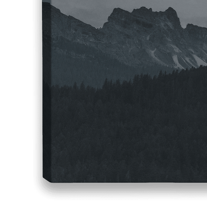 Een minimalistisch berglandschap in de Dolomieten, Italië, met gelaagdheid van bomen, rotspartijen en een halve maan tijdens blue hour.