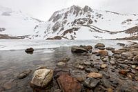 Besneeuwde bergtoppen hoog in het Andesgebergte. Het meer is nog half bevroren. De kleuren in de stenen op de voorgrond geven een mooi contrast in het landschap.