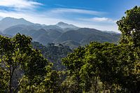 Tijdens de vakantie hebben we een rondreis met de auto gemaakt op het schiereiland van Mexico. Onderweg zijn we gestopt om deze foto te maken. Het is mooi weer en er hangen een paar wolken tussen de bergen die een mooi effect geven. Door het struikgewas op de voorgrond mee te fotograferen komt er veel diepte in de foto.