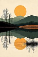 Een minimalistisch landschap waarin een warme oranje zon majestueus boven groene bergtoppen prijkt, perfect weerspiegeld in het kalme wateroppervlak. Kale bomen aan de oever en subtiele rietpluimen creëren een sereen contrast tegen de gedempte kleuren van de natuur, wat resulteert in een harmonieuze compositie die rust en balans uitstraalt.