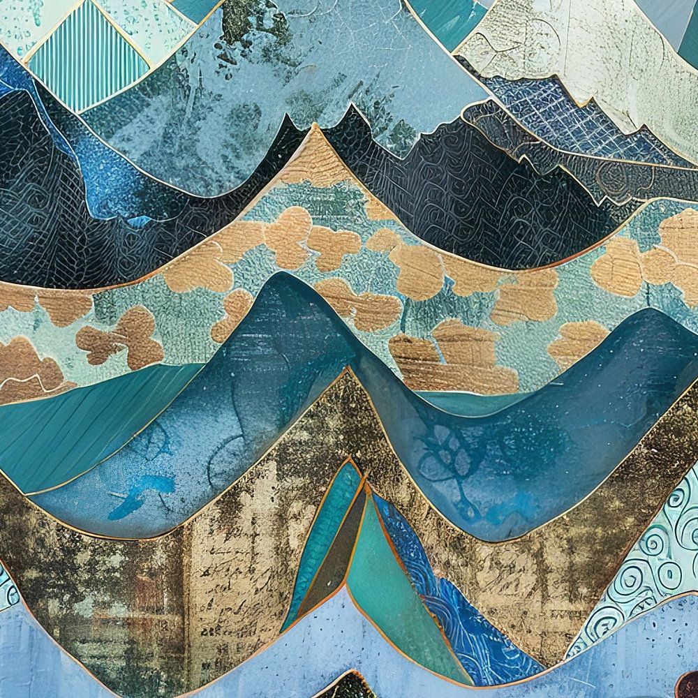 Deze prachtige schilderijen tonen een berglandschap in harmonieuze blauwtinten, geaccentueerd door stralend goud. De gebogen lijnen en verfijnde textuur creëren een moderne, abstracte voorstelling van bergen die zowel rustgevend als betoverend is. De gouden glinstering geeft de werken een luxueus tintje, terwijl de blauwe en groene tinten een diepe, natuurlijke band met de natuur creëren. Ideaal voor liefhebbers van moderne kunst en landschapsschilderijen die een vleugje elegantie en rust willen toevoegen aan hun woonruimte.