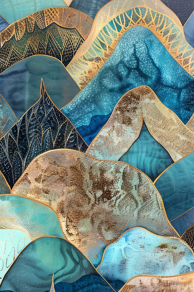 Deze prachtige schilderijen tonen een berglandschap in harmonieuze blauwtinten, geaccentueerd door stralend goud. De gebogen lijnen en verfijnde textuur creëren een moderne, abstracte voorstelling van bergen die zowel rustgevend als betoverend is. De gouden glinstering geeft de werken een luxueus tintje, terwijl de blauwe en groene tinten een diepe, natuurlijke band met de natuur creëren. Ideaal voor liefhebbers van moderne kunst en landschapsschilderijen die een vleugje elegantie en rust willen toevoegen aan hun woonruimte.