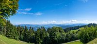 Berglandschap gezien vanaf de Pfänder in de Vorarlberg Alpen in Oostenrijk tijdens de zomer met weiden en bomen op de voorgrond.