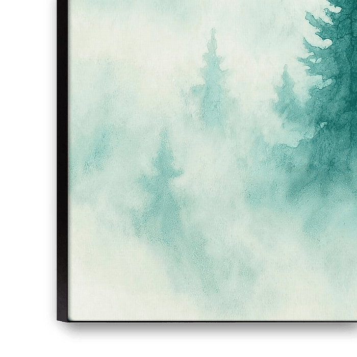 De dunne aquarelverf zorgt ervoor dat mist als het ware leeft. De achtergrond vervaagt in koele blauwgroene tonen, terwijl de voorgrond net iets scherper is, met zichtbaar penseelwerk in de silhouetten van de bomen. Het resultaat is een compositie die kalmerend en tijdloos aanvoelt.