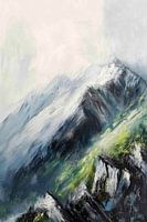 Een majestueus bergpanorama rijst op in een mystieke sfeer. De ruige rotsen worden omringd door zacht groen, terwijl delicate mistflarden de toppen omlijsten. De contrasten tussen het ijzige wit van de sneeuw en de aardetinten van het landschap geven het landschap een betoverende diepte die de kijker meesleept in de ongerepte natuur.