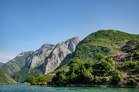 berglandschap in Noord Albanië. In het noorden van Albanië torenen de bergen aan de grens met Kosovo en Montenegro hoog op en worden door de 'Bergen van de Vervloekten' genoemd. De Drin rivier slingert zich een weg door de lager gelegen delen.