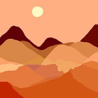 Kleurrijk landschapschilderij met bergen en maan in de kleuren terracotta, oranje, warme oker, natuurlijke kleuren en tere roos .