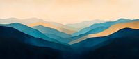 Zachte heuvels strekken zich uit in rustgevende blauwtinten, terwijl delicate goud- en aardetinten wijzen op een warme zonsopgang. Deze harmonieuze compositie creëert een ontspannen sfeer en is perfect voor de slaapkamer om vredige dromen en een gevoel van sereniteit te bevorderen.